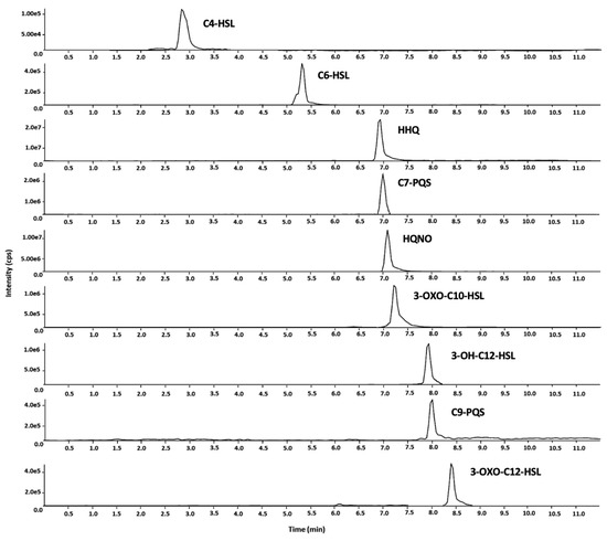 SRM chromatograms (quantifier fragment) for all the analytes of a mixed standard solution at 100 ng/mL. Legend: C4-HLS = N-butanoyl-L-homoserine lactone; C6-HLS = N-butanoyl-L-homoserine lactone; HHQ = 2-heptyl-4-quinolone; C7-PQS = 2-Heptyl-3-hydroxy-4(1H)-quinolone; HQNO = N-oxo-2-heptyl-4-Hydroxyquinoline; 3-OXO-C10-HSL = N-(3-oxodecanoyl)-L-homoserine lac-tone; 3-OH-C12 = N-(3- hydroxydodeca-noyl)-DL-homoserine lactone; C9-PQS = 2-nonyl-3-hydroxy-4(1H)-quinolone; 3-OXO-C12-HSL = N-(3-oxododecanoyl)-L-homoserine lactone.