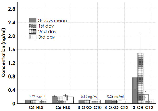 Among the various HSL molecules, only C6-HSL and 3-OH-C12-HSL were present at significant concentrations in the patient samples. Specifically, 3-OH-C12-HSL had a mean concentration of 0.8 ng/mL over three days, peaking at 1.5 ng/mL on the first day (Figure 3). No detectable concentrations of C4-HSL, 3-oxo-C10-HSL, or 3-oxo-C12-HSL were found.