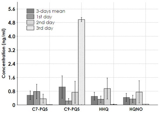 Figure 4 illustrates the concentrations of QS molecules in the AQ metabolite group. The concentrations of C7-PQS, C9-PQS, HHQ, and HQNO ranged from 0.5 to 1.5 ng/mL, with a peak of 5 ng/mL observed in one patient on the third day.