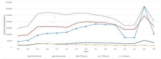 SFI medications’ utilization (number of prescriptions) from 2009 to 2023. Antifungal medications with fewer than 100,000 prescriptions were removed from the graph. *Others A include: terconazole, terbinafine, and ciclopirox. *Others B include: griseofulvin and miconazole.