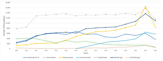 Utilization of IFI medications (number of prescriptions) from 2009 to 2023. Fluconazole was excluded due to its outlier prescription volume, which skewed the graph’s scale. Similarly, itraconazole was removed because of a sharp decline in prescriptions in 2010, which distorted the visual representation.