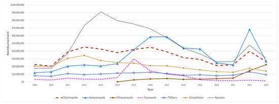 The reimbursement cost trends for griseofulvin, tioconazole, natamycin, ketoconazole, terbinafine, butoconazole, and efinaconazole closely mirror the patterns observed in their utilization curves, as indicated by joinpoint regression analyses. In contrast, the changes in reimbursement costs for the other medications did not align with the patterns seen in their prescription rates. Nystatin and clotrimazole spending exhibited more pronounced initial growth compared to their utilization curves, with APC = 57.28% and 31.53% (p-value < 0.05), followed by a steeper decline (APC = −12.28% and −5.55%, p-value < 0.05), respectively, resulting in a narrower angle. In contrast, terconazole showed a more gradual increase over a more extended period of time (APC = 8.85%, p-value < 0.05), with a sharper, fluctuated decline (APC = −3.55%, p-value < 0.05) when compared with its utilization slope. Over the initial three years, both oxiconazole and naftifine demonstrated an upward trend, with naftifine experiencing a more pronounced increase in 2011. However, both medications significantly declined from 2011 to 2014, characterized by approximately equivalent annual percentage changes (APC). Subsequently, both agents entered a plateau phase. This trend was reversed for oxiconazole after 2021 and saw a substantial increase in APC, reaching 78.29%. Butenafine and miconazole exhibited consistent decreases over the years. However, this downward trend ceased for miconazole in 2015, resulting in a stabilization of its utilization at a steady state. Econazole showed initial fluctuations, followed by a notable peak in 2015, with a subsequent sharp decline. Ciclopirox exhibited no discernible pattern, as its levels fluctuated throughout the study period (Figure S5, Supplementary Materials).
