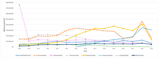 Itraconazole, isavuconazole, caspofungin, and anidulafungin had reimbursement trends similar to their patterns. Amphotericin B exhibited a significant rise until 2012, reversed by growing fluctuations until the study’s conclusion. Similarly, fluconazole demonstrated a growing APC until 2015, after which it started to decline. Furthermore, the reimbursement costs for micafungin and posaconazole continuously rose until 2017, followed by slight, insignificant decreases thereafter. Voriconazole saw a significant initial spike, which was followed by a gradual decline over time (Figure S8, Supplementary Materials).