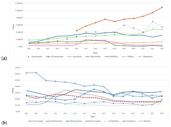 Prices (reimbursement per prescription) for SFI medications from 2009 to 2023. (a) The graph includes medications priced above USD 60. *Others include: griseofulvin and butoconazole. (b) The graph includes medications priced below USD 60.