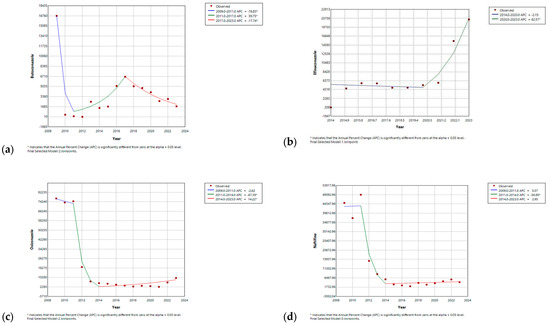 One Joinpoint model distinctly illustrates the previously discussed significant drop in itraconazole utilization in 2010, followed by stabilization at a plateau with minimal variation throughout the study period. On the other hand, the APCs of amphotericin B, micafungin, and voriconazole started with significant growth until 2012 (APC = 36.58%, 37.43%, and 22.21% (p-value < 0.05), respectively). After that, APC of amphotericin B exhibited a slow decline, whereas that of micafungin continued to grow steadily, albeit at a slower rate, while voriconazole’s remained relatively stable for most years. Fluconazole had a more gradual increase over a more extended period of time before reversing and declining back to baseline levels by the end of the study period. Isavuconazole and posaconazole saw consistent and significant increases over the years, with APCs of 20.83% and 10.96% (p-value < 0.05), respectively. In contrast, caspofungin showed a steady decline throughout the study period, with an APC of −8.66%. Anidulafungin began with a gradual decrease until 2013, followed by a significant rise, before increasing in 2023 (Figure S7, Supplementary Materials).