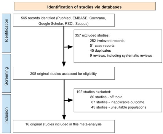The remaining 208 studies underwent rigorous full-text evaluation against our predefined inclusion criteria. This detailed assessment led to the exclusion of an additional 192 articles that failed to meet our methodological standards (80 had inapplicable outcomes, 67 involved insufficient patient populations, and 45 included unsuitable populations). Ultimately, only 16 original studies satisfied all eligibility requirements and were included in our final meta-analysis (Figure 1, Table 1) [14,19,21,22,23,24,25,26,27,28,29,30,31,32,33,34].