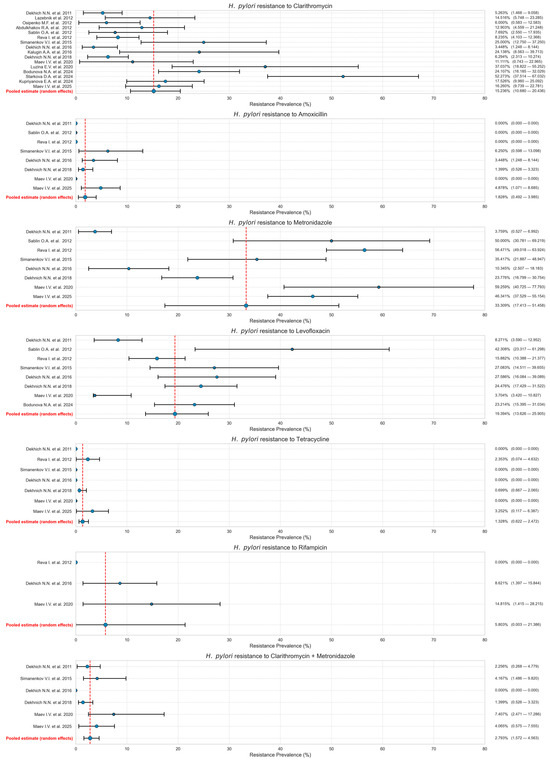 This systematic review and meta-analysis aimed to evaluate the dynamics of H. pylori antibiotic resistance in Russia. The analysis incorporated 16 studies comprising 1206 H. pylori isolates. The pooled prevalences of H. pylori resistance were as follows: 15.236% to clarithromycin, 1.828% to amoxicillin, 33.309% to metronidazole, 19.394% to levofloxacin, and 1.328% to tetracycline. The analysis of studies from the most recent 10-year period (2015–2025) revealed increasing resistance trends for nearly all antibiotics, with an increase of 19.014% for clarithromycin, 2.977% for amoxicillin, 35.760% for metronidazole, 18.277% for levofloxacin, and 1.565% for tetracycline. These findings align with recent data from the Hp-EuReg study that showed European resistance rates of 22% for clarithromycin, 27% for metronidazole, and 18% for fluoroquinolones [37]. Similarly, a recent global meta-analysis of 10-year antibiotic resistance data reported European resistance rates of 21.3% for clarithromycin and 29.9% for metronidazole [42].