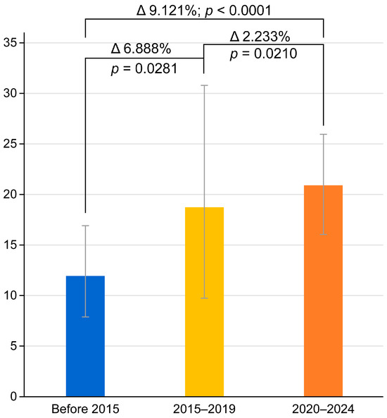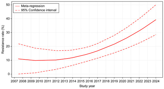 For the chronological analysis of resistance dynamics, the studies were divided into three periods based on isolate collection: Period 1 (pre-2015) [21,22,23,24,25,26,27,33], Period 2 (2015–2019) [14,19,28,29,30,31,32,33,34], and Period 3 (2020–2024) [14,19,34]. One study [33] was excluded from the final trend analysis due to limited isolates in Period 3 (n = 5). This periodization enabled evaluating the evolution of resistance, including post-COVID-19 changes.