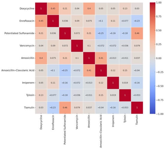The correlation analysis examined the relationships between different antimicrobial resistances (Figure 2). A Pearson correlation matrix was used to quantify the associations between antibiotics, which may have emerged due to shared mechanisms of action or simultaneous use. The heatmap provides a comprehensive overview of potentially significant association patterns. Notably, a strong positive correlation was observed between potentiated sulfonamide and tiamulin (0.46), enrofloxacin and doxycycline (0.45), and amoxicillin and amoxicillin-clavulanate (0.41). These correlations suggest that some antibiotics may be commonly used together, contributing to the development of cross-resistance.