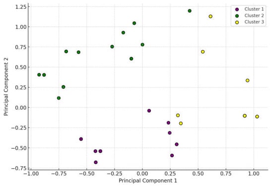 The cluster analysis categorized the isolates into three groups exhibiting different dominant antimicrobial resistances (Figure 3). Cluster 1 (purple) and Cluster 2 (green) predominantly displayed resistance to doxycycline, while Cluster 3 (yellow) showed extensive resistance to tylosin. These results indicate that certain groups of S. aureus strains exhibit distinct resistance profiles, potentially influenced by the frequent use of particular antibiotics or other factors.
