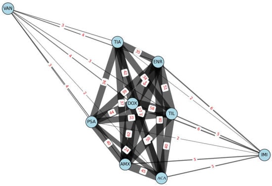 A network graph illustrating the resistance profile of Staphylococcus aureus isolates from pigeons (n = 73). AMX—amoxicillin; ACA—amoxicillin-clavulanic acid; DOX—doxycycline; ENR—enrofloxacin; IMI—imipenem; PSA—potentiated sulfonamide; TIL—tylosin; VAN—vancomycin; TIA—tiamulin.