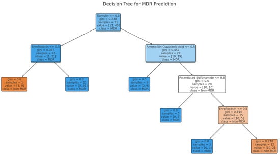 Using a decision tree model, we attempted to predict the presence of MDR strains (Figure 5). The most significant variables influencing resistance were tiamulin, enrofloxacin, and amoxicillin-clavulanate. The model achieved an accuracy of 86.5%, with a precision of 94.4%, sensitivity of 89.5%, and an F1 score of 91.9%. These results demonstrate that specific antibiotics contribute significantly to predicting MDR strains, highlighting the importance of monitoring their usage to prevent resistance.