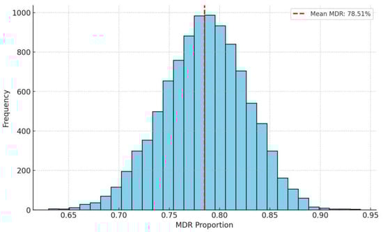 A Monte Carlo simulation was conducted to estimate the probability of MDR S. aureus strains based on the available data (Figure 6). The simulation consisted of 10,000 iterations, each analyzing the results of 100 samples. The mean MDR occurrence was 78.51%, supported by the median value of the histogram, indicating a symmetrical distribution around the mean. The range of distribution varied from approximately 0.65 to 0.95, suggesting that while MDR strains dominate, non-MDR strains can still be present. The results of the Monte Carlo simulation highlight the need for targeted surveillance and improved antimicrobial stewardship to reduce the prevalence of MDR strains in pigeons.
