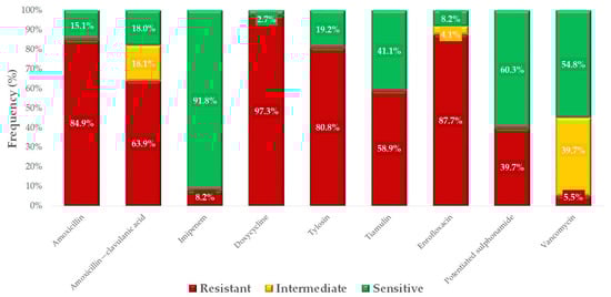 We determined the proportion of susceptible and resistant strains for each active ingredient based on clinical breakpoints (Figure 7). Remarkably high resistance was detected for doxycycline (97.3%), enrofloxacin (87.7%), and amoxicillin (84.9%). The lowest resistance levels were observed against vancomycin (5.5%) and imipenem (8.2%).