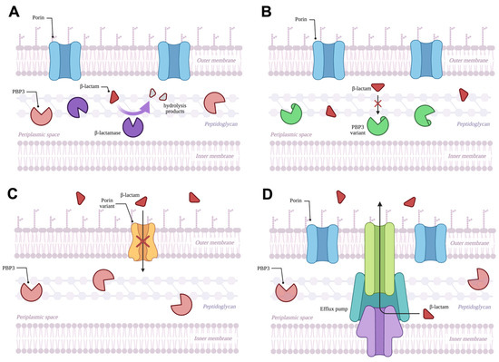 Porins are β-barrel proteins that mediate the passive entry of hydrophilic compounds (including β-lactam antibiotics) across the outer membranes of Gram-negative bacteria [82,83]. As such, mutations that cause changes to porin structure or to the number of porins in the outer membrane can protect bacteria from β-lactam activity (Figure 2C). While not all 26 porins identified in P. aeruginosa are involved in β-lactam uptake, those belonging to the OprD and Opd (P/D/H) families have been investigated for their role in β-lactam resistance [84]. In addition to small basic amino acids and peptides, the OprD porin is a crucial mediator in the uptake of carbapenems in P. aeruginosa [85,86,87,88]. Point mutations, premature stop codons, and frameshifts in the oprD gene have been shown to reduce or abolish OprD expression and lead to carbapenem resistance [88]. Of note, mutations to oprD were not observed to impact susceptibility to other β-lactam antibiotics (e.g., penicillins, cephalosporins, and monobactams) [89,90,91]. Regarding the Opd family of porins, the loss of OpdP was shown to reduce susceptibility to meropenem and, in an opdD knockout strain, to imipenem and doripenem as well, supporting that OpdD facilitates the entry of carbapenems in P. aeruginosa [91]. The loss of OpdH was also shown to reduce susceptibility to ceftazidime but not other cephalosporins [89,90,91,92].