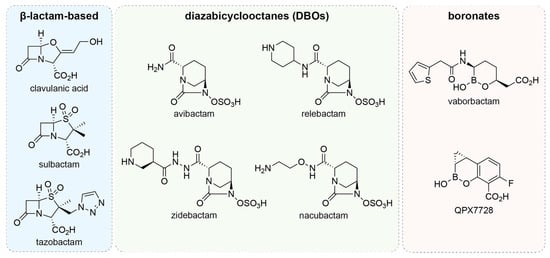 Representative β-lactamase inhibitors. Chemical structures of selected β-lactamase inhibitors that are in current use or under clinical development, organized according to their scaffolds as β-lactams, diazabicyclooctanes, and boronates.