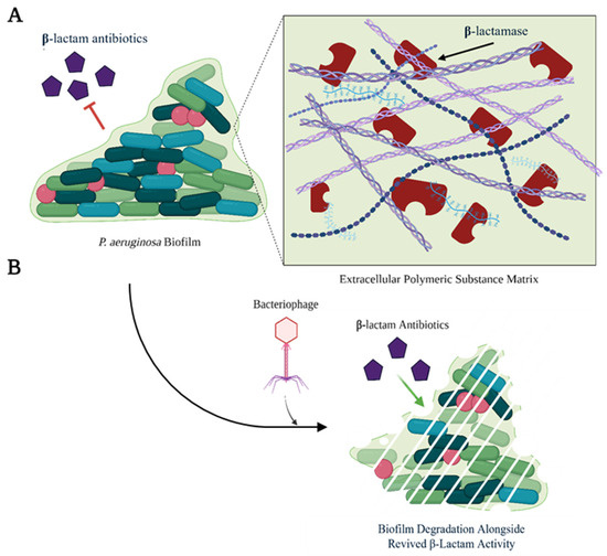 Synergistic use of bacteriophages with β-lactams against P. aeruginosa. (A) Biofilms produced by P. aeruginosa act as a physical barrier to β-lactams and serve as reservoirs for the accumulation of β-lactamases. These enzymes can inactivate β-lactam antibiotics before they enter the bacterial cells embedded in the biofilm. (B) Degradation of P. aeruginosa biofilms by bacteriophages can revive the efficacy of β-lactams by dispersing reservoirs of extracellular β-lactamases. Created in BioRender.