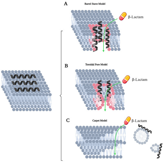 Although AMPs exhibit different bactericidal mechanisms, they can be broadly classified as agents that either directly target the bacterial membrane or that target other cellular components. AMPs that target the bacterial membrane remain selectively toxic, as the membranes of mammalian cells are primarily composed of net-neutral phospholipids (phosphatidylcholine, phosphatidylethanolamine, sphingomyelins) [184]. These membrane-targeting peptides are believed to act through three distinct mechanisms that have the potential to facilitate β-lactam entry across the outer membrane (Figure 5), as has been extensively reviewed elsewhere [185,186,187,188,189,190,191,192,193,194,195].