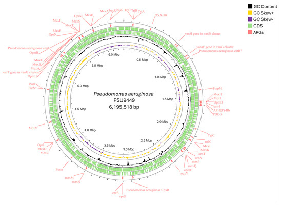 The whole-genome sequencing provided 37 contigs. The genome assembly size of P. aeruginosa PSU9449 was 6,195,518 bp with a GC content of 66.4%. The N50 of the genome was 399,445 bp, while the L50 was contig 6. Genome annotation revealed a total of 5683 genes, including 5607 coding sequences (CDS), 68 tRNAs, four rRNAs, one tmRNA, and three CRISPRs. General information, including 51 predicted antimicrobial resistance genes (ARGs) and 284 predicted virulence factor genes (VFGs), based on bioinformatic analysis of the draft genome assembly, is provided in Table 1. A circular map representing the draft genome and the predicted locations of resistance genes is shown in Figure 1.