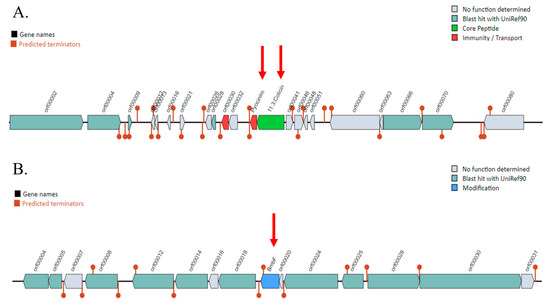 Prediction of bacteriocin gene clusters in the Pseudomonas aeruginosa PSU9449 genome using the BAGEL4 web server. The locations of the bacteriocin are indicated by red arrows. (A) Bacteriocin genes encoded on Contig 3, including pyocin classes such as pyocinIm and colicin. (B) The BmbF gene encoding bottromycin located on Contig 25.
