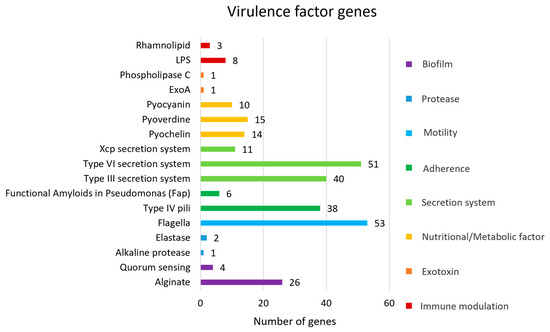 Bioinformatic analysis predicted 284 VFGs associated with biofilm formation, protease activity, motility, adherence, secretion systems, nutritional/metabolic factors, exotoxins, and immune modulation (Figure 3). The most prevalent VFGs were associated with flagella, which are crucial for motility, chemotaxis, surface colonization, adhesion to host tissues, and cell invasion [35]. The genes associated with flagellar expression and function, including fli, che, fle, flg, flh, and mot genes, play key roles in the assembly and formation of the basal body-hook complex and the regulation of the bacterial flagellum. Flagella are essential for bacterial motility, contributing to bacterial survival, host colonization, and pathogenicity [36]. The alg and muc genes are critical for the biosynthesis and regulation of alginate and mucopolysaccharides, which contribute to the biofilm matrix, bacterial biofilm formation, and virulence. Biofilm formation enhances bacterial survival and improves the bacteria’s ability to resist environmental stresses. The type 6 secretion system (T6SS) plays an important role in interbacterial competition (hcp gene) and interaction with host cells (vgrG, pldA gene). The T6SS is composed of several proteins that assemble into a structure resembling an inverted phage tail, which can puncture target cell membranes to deliver effector proteins. Additionally, the regulation of T6SS serves multiple virulence functions, including quorum sensing (QS) (las, rhl gene) and biofilm formation (tssA gene) [37]. Moreover, the type 3 secretion system (T3SS) plays an essential role in pathogenicity. It is a needle-like structure that can penetrate host cell membranes to deliver effector proteins into the host cell. These proteins are associated with facilitating disruption of host cell signaling (exoS gene), cytotoxicity (exoU gene), immune evasion (exoT gene), and manipulation of the host cell cytoskeleton (exoY gene) [38].