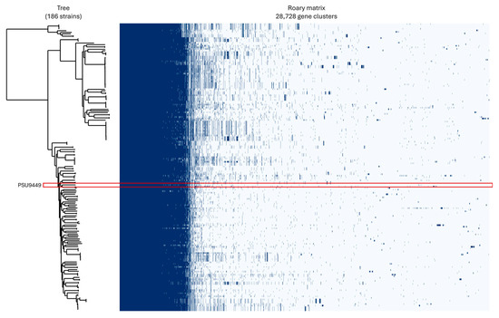 P. aeruginosa PSU9449 was compared with 185 genome assemblies of P. aeruginosa found in Thailand and neighboring countries (3 strains in Cambodia, 23 strains in Malaysia, 29 strains in Myanmar, and 129 strains in Thailand). These genomes were retrieved from the GenBank database [accessed on 31 October 2023]. The pan-genome profile was analyzed using Roary v3.13.0 with the default settings [62].
