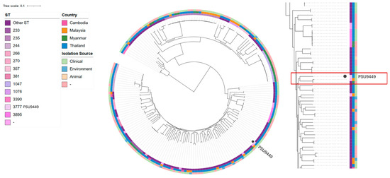 A single-nucleotide polymorphism (SNP) phylogenetic tree indicating the core genes of the Pseudomonas aeruginosa PSU9449 genome compared with 185 genomes in Cambodia, Malaysia, Myanmar, and Thailand. The innermost circles represent ST, country, and isolation source, respectively.
