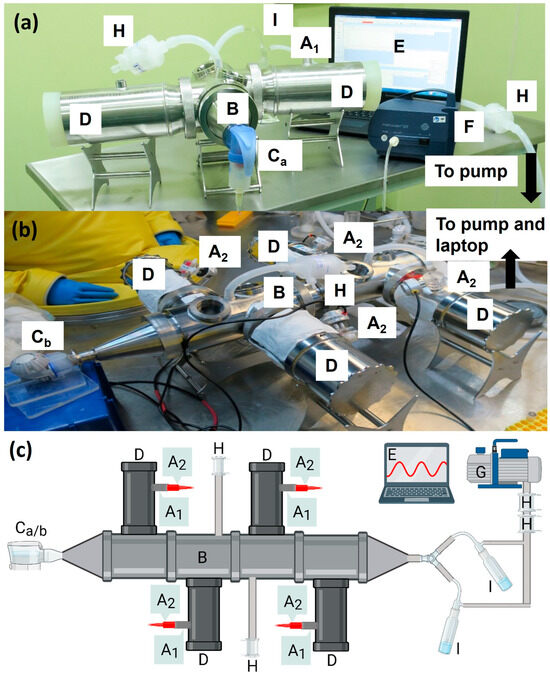 The marmoset inhalational therapy system (MITS) set up to enable delivery of aerosolised Apulmiq to marmosets (a) outside of containment (b) or within a high containment isolator system. (c) A schematic of the system used in high containment (created with BioRender.com). Animals were anaesthetised and placed into the plethysmography tubes (D) with their heads in the exposure chamber (B). The drug was aerosolised using either the Pari LC Sprint® jet nebuliser (Ca) or the Pari eFlow Rapid nebuliser system (Cb). For the LC Sprint, the Pari Boy SX compressor (F) generated the airflow to nebulise the drug at a rate of 5.1 L/min. The vacuum pump (G) drew the nebulised drug through the chamber at a rate of 5.9 L/min. Pall Emflon filters ii in Kleenpak capsules (KA1V002PV2G) (H) were used to filter air leaving the system and to maintain a steady pressure in the exposure unit. Impingers (I) were placed downstream of the exposure unit to sample the air to estimate the concentration of antibiotic present in the aerosol. A pneumotachograph (A2) was attached at the port (A1) to monitor the volume inhaled by the individual animal using plethysmography in real time, which was visualised on the laptop (E).