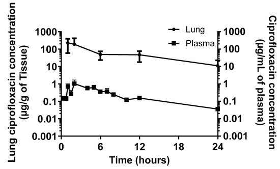 The concentration of ciprofloxacin was determined in the plasma and lungs from a cohort of 15 marmosets administered a single dose of Apulmiq for 1 h (Figure 3). The mean dose of antibiotic received in the lung was 1.94 mg/kg body weight due to a higher breathing rate in this cohort of animals. Non-compartmental PK analysis of the mean concentration–time profiles of ciprofloxacin in the lung and plasma was performed using WinNonlin Phoenix v.6.1 (Pharsight Corp., Sunnyvale, CA, USA) (Table 1). A maximum concentration (Cmax) of 226.5 μg/g was reached by 1 h (Tmax) in the lungs of animals. In the plasma, the Cmax of 1.05 μg/mL was achieved at a Tmax of 2 h post-dosing. The terminal half-life (T1/2) of Apulmiq was 5.6 and 6.03 h in the lungs and plasma, respectively. The area under the concentration–time curve (AUC) was 1654 μg·h/mL and 6.20 μg·h/mL in the lungs and plasma, respectively.