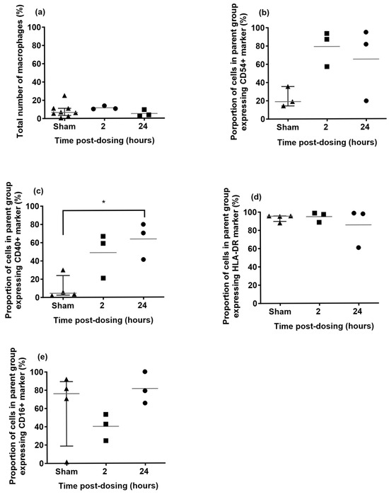 Phenotyping of alveolar macrophages from marmosets exposed to Apulmiq or a sham, phosphate buffered saline (PBS). Animals exposed to Apulmiq were euthanised 2 or 24 h later. (a) Total number of macrophages, (b) expression of the migratory marker, CD54+, (c) expression of the inflammatory marker, CD40+, (d) expression of the MHC class II marker, HLA-DR+ and (e) expression of the alternative activation marker, CD16+. A one-way ANOVA was performed, where * p = 0.0190.