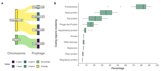 Prophage regions found at the chromosomal level in P. salmonis strains: (A) Number of prophage regions per chromosome (genome): green indicates no prophage detected in 24 strains; yellow indicates the presence of prophages in 55 strains; these were grouped based on the number of prophage regions detected. (B) Percentage clustering of coding regions (CDS), according to blastp results, contained in the prophage regions.