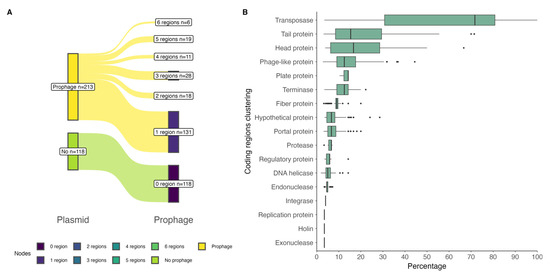 Prophage regions found at the plasmidial level in P. salmonis strains: (A) Number of prophage regions per plasmid: green indicates no prophage detected in 118 plasmids; yellow indicates the presence of prophages in 213 plasmids; these were grouped based on the number of prophage regions detected. (B) Percentage clustering of coding regions, according to blastp results, contained in the prophage regions.