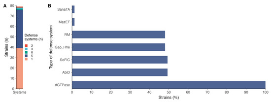 The presence and type of antiphage defense systems in chromosomes and plasmids of each strain were evaluated in the DefenseFinder tool version 2.0.0 [36]. This tool detects macromolecular systems using MacSyFinder, which operates using one model per system. Each model functions in two steps: (i) detection of all proteins involved in a macromolecular system by searching for homologies using HMM profiles, and (ii) a set of decision rules is applied to stay with those HMM hits that satisfy the genetic architecture of the system of interest.