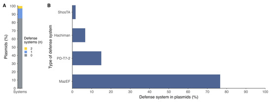 Of the total genomes analyzed, 78 strains contained plasmid genomic information, of which 37 comprised plasmidial defense systems. Of the total number of plasmids, only 15% contained antiphage defense systems, of which the majority presented only one system per plasmid (Figure 4A). The types of systems found in the plasmids were differently conformed in relation to those found in the chromosomes; in the case of plasmids, the majority type was MazEF (Figure 4B; Supplementary Material Table S7), which was present in a small proportion at the chromosome level.