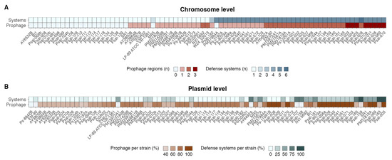 The number of prophage regions and the number of defense systems in the chromosomes of P. salmonis strains presented a high positive correlation (Spearman’s rho = 0.72, p = 6.3 × 10−14), indicating that the higher the number of prophage regions, the higher the number of antiphage systems present in the strains (Figure 5A). At the plasmid level, there is also a significant positive correlation between the number of prophage regions and defense systems; however, in this case, this correlation is low (Spearman’s rho = 0.22, p = 6.5 × 10−5). This is clear when visualizing the proportion of plasmids with prophage regions and defense systems per strain, where no trend is observed between these two variables (Figure 5B), as observed at the chromosomal level.