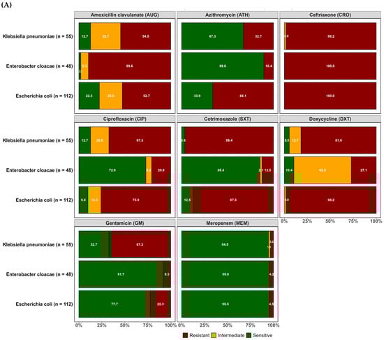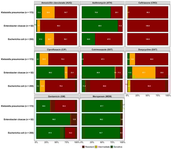 Overall, resistance to the third-generation cephalosporin ceftriaxone was common in the three ESBL-producing pathogens, as expected. Considering each species individually, ESBL E. coli isolates showed the highest resistance to ceftriaxone (100.0%), followed by doxycycline (92.5%), cotrimoxazole (88.6%), ciprofloxacin (78.4%), and gentamicin (32.2%). Relatively, the lowest resistance rate was observed to meropenem in ESBL E. coli (6.3%). For ESBL Klebsiella pneumoniae, the highest resistance rate was observed for ceftriaxone (98.3%), followed by doxycycline (80.8%), cotrimoxazole (97.1%), and ciprofloxacin (70.3%). However, lower resistance was observed for azithromycin (29.1%) and the lowest resistance for meropenem (1.2%). ESBL Enterobacter cloacae were more susceptible to most of the antibiotics that were tested, except for ceftriaxone (100%), a third-generation cephalosporin, and amoxicillin clavulanate (90.4%), to which intrinsic resistance has been reported (Figure 1).