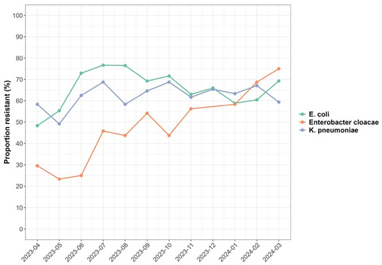 Trends in the proportion of all the ESBL organisms resistant to antibiotics isolated each month over 12 months.