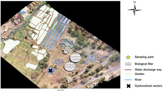 Layout of the Soche wastewater treatment plant showing the sampling point for effluent and the discharge way into nearby gardens and the river.