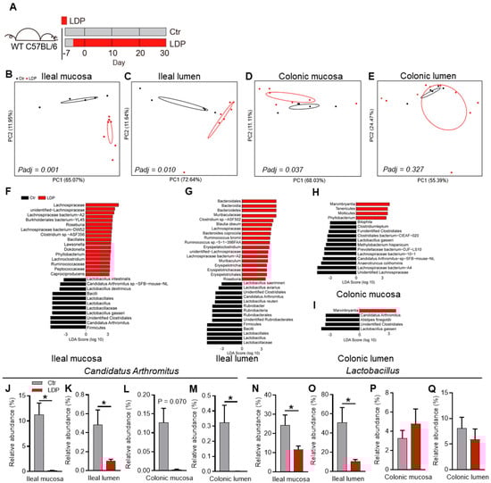 We then analyzed the influence of LDP on OTUs based on Linear Discriminant Analysis Effect Size (LEfSe). LDP treatment mainly resulted in a reduction in Lactobacillus and Candidatus Arthromitus (segmented filamentous bacteria (SFB)) in all examined intestinal regions (Figure 1F–Q). It is also worth noting that a broader difference was observed between the ileal samples of the LDP and Ctr mice than in colonic samples (Figure 1F–I).