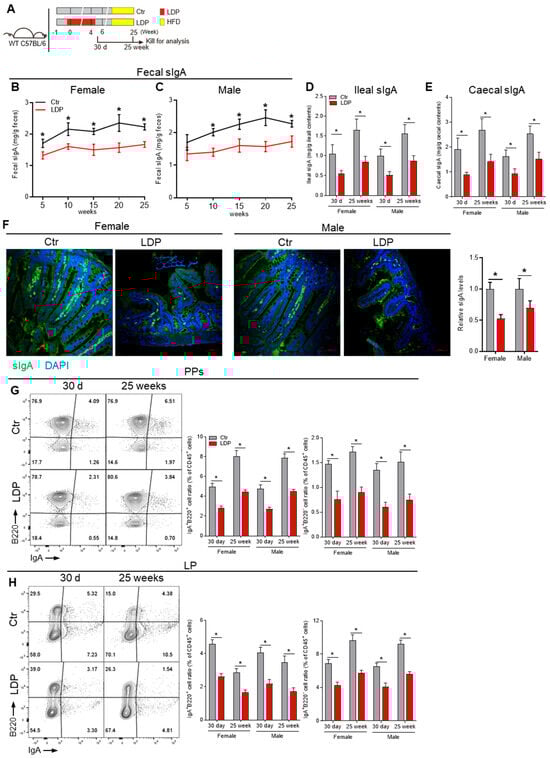 Intestinal sIgA is mainly produced by IgA+ plasma cells (PCs) in the lamina propria (LP) [17]. LDP significantly decreased IgA+B220+ B cells and IgA+B220− PCs in the LP of both 30 d and 25-week mice (Figure 2H). IgA+ PCs mainly originated from Peyer’s patches (PPs) [17]. Consistently, LDP significantly decreased IgA+B220+ B cells and IgA+B220− PCs in the PPs of both 30 d and 25-week mice (Figure 2G).