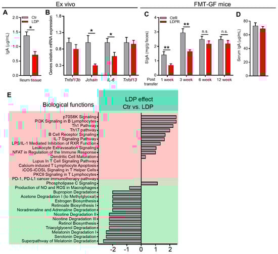 LDP-induced inhibition of IgA response is GM- and early life-dependent. (A,B) IgA production (A) and relative gene expression (B) in the mouse ileum during ex vivo cultivation with fecal microbiota antigens derived from the Ctr and LDP mice, n = 4. (C,D) The fecal (C) and serum (D) (s)IgA levels of the conventionalized GF mice transferred fecal microbiota from 30 d Ctr and LDP mice, n = 8. (E) Predicted canonical pathways determined by Ingenuity Pathway Analysis of the RNA-sequencing of ileal gene expression, n = 5. Data are presented as mean ± SEM. Statistical significance is determined by Mann–Whitney U test (* p < 0.05, ** p < 0.01, n.s. stands for not significant (p> 0.05)).