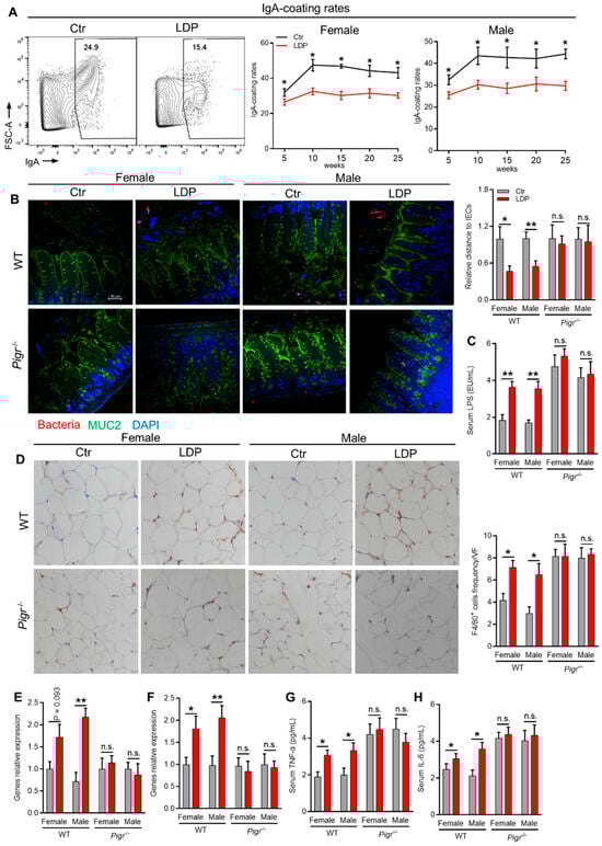 As expected, LDP significantly decreased the binding of GM by IgA across the 25-week experiment (Figure 4A). Consistent with this, fluorescence in situ hybridization (FISH) analysis targeting bacteria showed that LDP significantly reduced the distance between the bacteria and IECs in WT but not in sIgA-deficient (Pigr−/−) mice (Figure 4B). The deficiency of fecal sIgA in Pigr−/− mice was verified by direct measurement of sIgA using ELISA (Figure S3). This LDP-induced compromised control of bacteria by sIgA was accompanied by an increase in serum LPS in WT but not Pigr−/− mice (Figure 4C). Consistently, serum inflammatory factors, TNF-α and IL-6, were significantly increased in LDP-treated WT mice (Figure 4G,H).