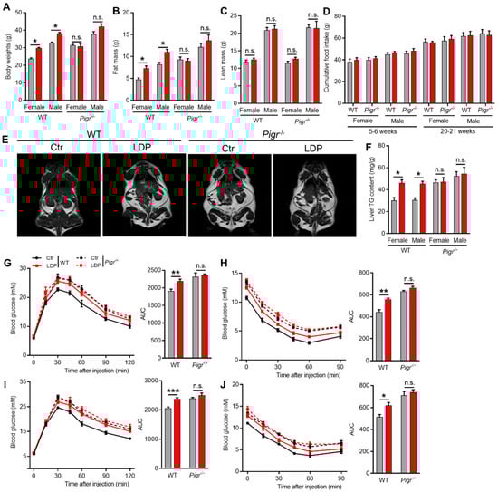 Consistent with a previous study [1], LDP enhanced the development of Western diet-induced MetS in WT mice, including increases in body (Figure 5A) and (Figure 5B) fat masses, adiposity (Figure 5C), and hepatic triglyceride (TG) (Figure 5F). In addition, the glucose tolerance and insulin sensitivity were also impaired by LDP treatment in WT mice (Figure 5G–J). These changes were not related to the energy intake (Figure 5D). Notably, although Pigr−/− mice showed exaggerated MetS compared to WT mice, no significant changes in the above parameters were observed between Ctr and LDP Pigr−/− mice (Figure 5).