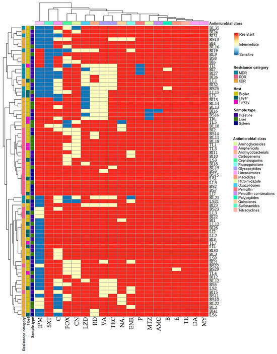 Hierarchical clustering heatmap showing the overall distribution of the investigated C. perfringens isolates based on the phenotypic antimicrobial resistance pattern. The code numbers on the right of the heatmap refer to the isolates from broiler liver (BL), broiler spleen (BS), broiler intestine (BI), layer liver (LL), layer spleen (LS), layer intestine (LI), turkey intestine (TI), and turkey liver (TL) samples. Different antimicrobial classes, resistance categories, hosts, and sample types are color-coded on the right of the heatmap. P: penicillin G benzylpenicillin, AMC: amoxycillin-clavulanic acid, FOX: cefoxitin, IPM: imipenem, CN: gentamicin, E: erythromycin, NA: nalidixic acid, ENR: enrofloxacin, SXT: sulfamethoxazole-trimethoprim, C: chloramphenicol, B: bacitracin, LZD: linezolid, DA: clindamycin, MY: lincomycin, TE: tetracycline, VA: vancomycin, TEC: teicoplanin, MTZ: metronidazole, RD: rifampin.