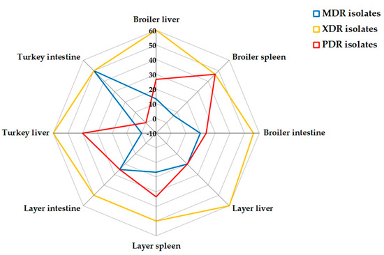Occurrence of MDR, XDR, and PDR categories in C. perfringens isolated from poultry. MDR: multidrug-resistant; XDR: extensive drug-resistant; PDR: pan drug-resistant. Antimicrobial resistance categories are indicated in the colour key; green color originates from the overlapping of both blue and yellow colors, which means that green color contains both MDR and XDR isolates.