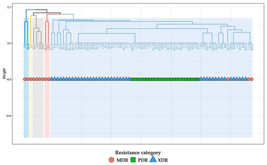 Hierarchical clustering dendrogram showing the relatedness of C. perfringens as determined by the antimicrobial resistance profiles. The code numbers refer to the isolates from broiler liver (BL), broiler spleen (BS), broiler intestine (BI), layer liver (LL), layer spleen (LS), layer intestine (LI), turkey intestine (TI), and turkey liver (TL) samples. MDR: multidrug-resistant; XDR: extensive drug-resistant; PDR: pan drug-resistant.