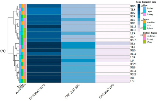 Heatmap showing the antimicrobial (A) and antibiofilm (B) activities of various concentrations of cellulose nanocrystal/ZnO (CNCs/ZnO) bio-nanocomposite against pan drug-resistant C. perfringens isolates. The scale on the right of the heatmap A refers to zone diameter in mm, and in heatmap B, it refers to biofilm inhibition%. The code numbers on the right of the heat map refer to the isolates from broiler liver (BL), broiler spleen (BS), broiler intestine (BI), layer liver (LL), layer spleen (LS), layer intestine (LI), and turkey liver (TL) samples. Different host and sample types are color-coded on the right of the heatmap.