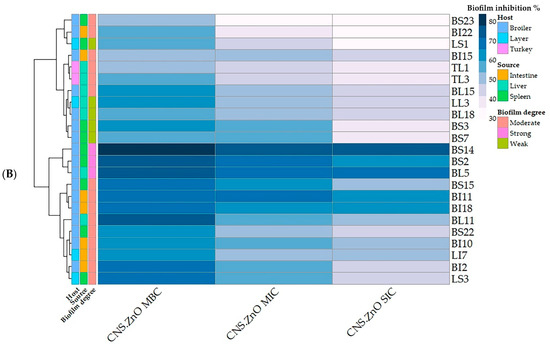 Table 4 and Figure 6 display the antibiofilm activities of CNCs/ZnO bio-nanocomposite at their MBC, MIC, and SIC against 23 PDR C. perfringens isolates. The results showed that CNCs/ZnO exerted great activity against the pre-existent biofilms of PDR C. perfringens isolates in a dose-dependent manner ((MBIC50 up to 83.43 ± 1.98 for the CNS-ZnO MBC concentration (0.25 μg/mL)) (Supplementary Table S1 and Supplementary Figure S4). There were significant differences in the antibiofilm activities among MBC, MIC, and SIC of CNCs/ZnO bio-nanocomposite against the examined PDR C. perfringens isolates (p < 0.05) except isolates of code no. BI18 and BL5. CNCs/ZnO bio-nanocomposite at their MBC showed the highest biofilm inhibition% in 14 tested isolates. CNCs/ZnO bio-nanocomposite at their MIC and SIC showed the highest biofilm inhibition% in 7 tested isolates.