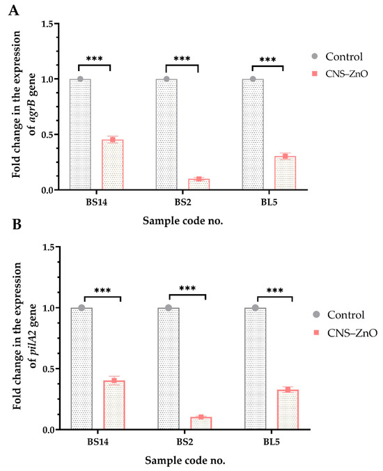 The expression of agrB quorum sensing gene and pilA2 type IV pili biosynthesis gene responsible for biofilm formation were determined by the RT-qPCR technique pre- and post-treatment with the CNCs/ZnO nanocomposite. The results showed that the transcript levels of agrB and pilA2 genes in CNCs/ZnO-treated biofilms decreased (0.099 ± 0.012–0.454 ± 0.031 and 0.104 ± 0.006–0.403 ± 0.035, respectively) when compared to the non-treated isolates. There were statistically significant differences in the transcriptional modulation of agrB and pilA2 genes among CNCs/ZnO treated and control untreated C. perfringens isolates (p < 0.0001) (Figure 7).