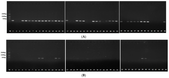 The PCR mixture included sense and antisense primers (Table 5), Taq PCR PreMix (AccuPower®, Daejeon, Republic of Korea), template DNA, and distilled water. PCR was performed under the following conditions: 10 min at 95 °C, followed by 30 cycles of 30 s at 95 °C, 30 s at each annealing temperature, and 30 s at 75 °C. After PCR, the products were run on 1% agarose gels, and bands were developed using an ultraviolet transilluminator and photographed.